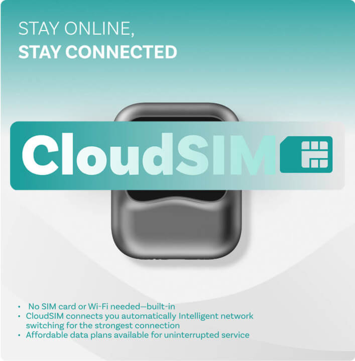 No se necesita tarjeta SIM ni Wi-Fi: CloudSIM incorporado te conecta automáticamente. Cambio inteligente de red para la conexión más fuerte.